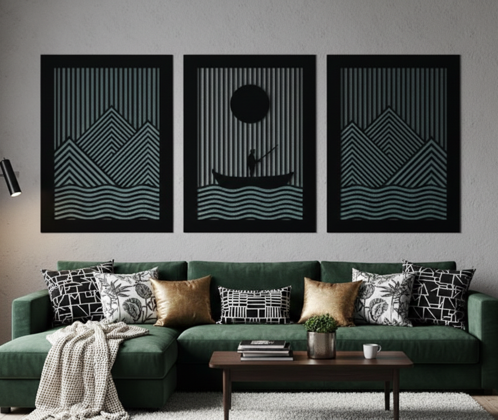 Crafted from premium-quality metal with a sleek matte black finish, the linear detailing adds depth and dimension while maintaining a clean, contemporary feel. The triptych layout offers balance and symmetry, making it an eye-catching focal point for larger walls.