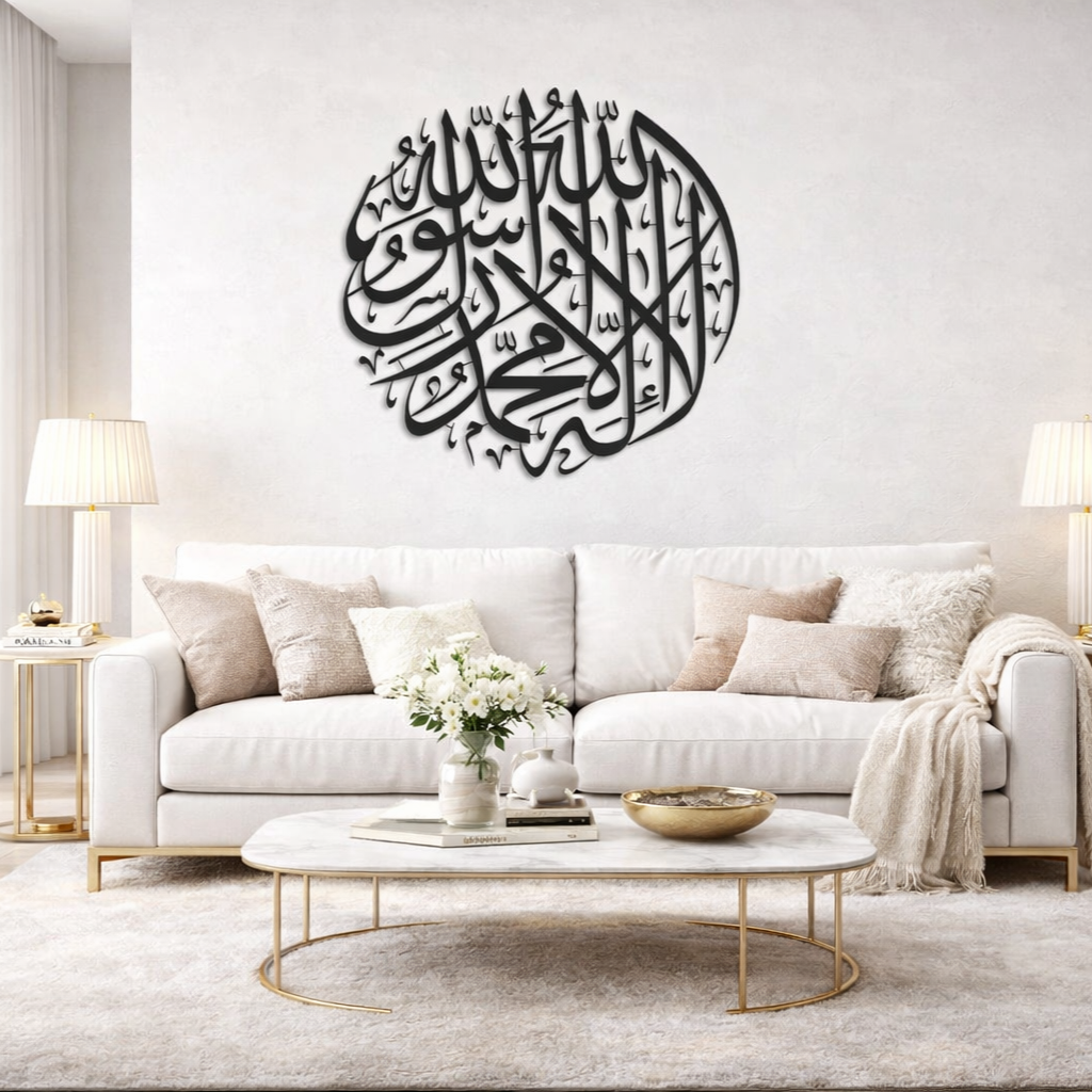 Enhance your space with the sacred beauty of this Kalma Calligraphy Metal Wall Art, a powerful expression of faith rendered in graceful Arabic calligraphy. Shaped in a harmonious circular form, this artwork presents the Kalma in flowing script, symbolizing unity, belief, and spiritual balance.