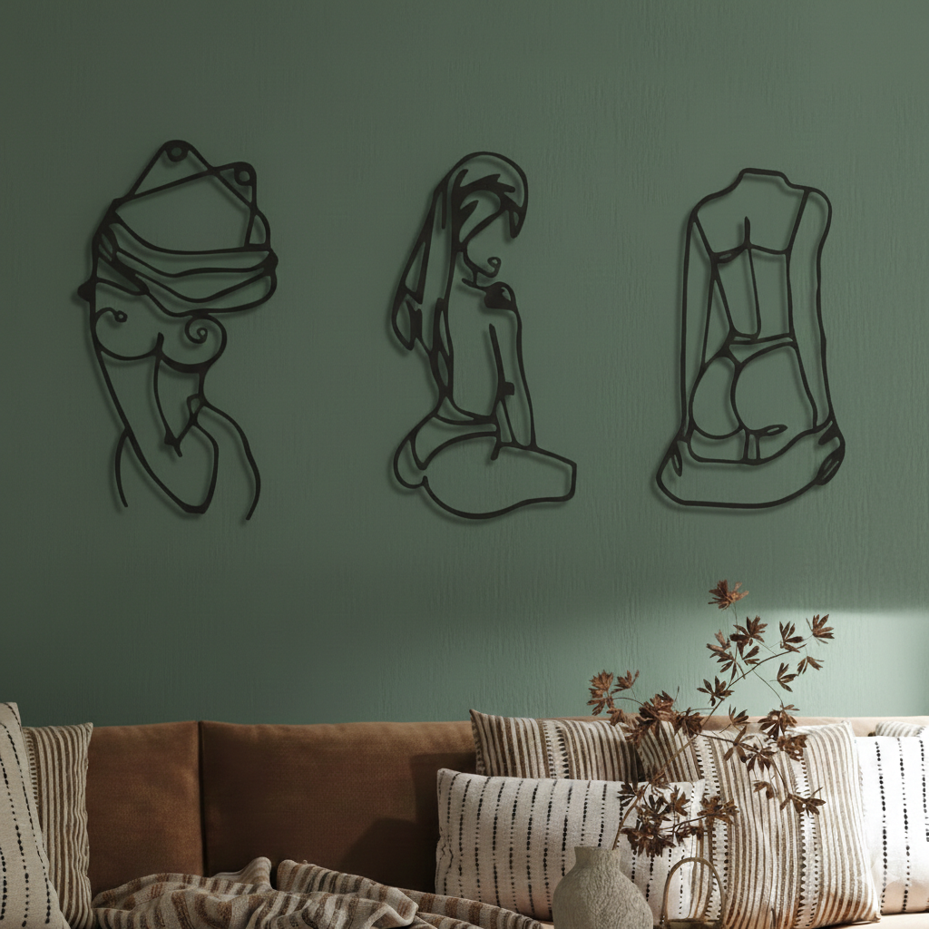 Inspired by classical sculpture and modern line art, Muse transforms the human body into a poetic visual rhythm. The open metal design allows light and shadow to play across the wall, giving the artwork a dynamic presence that subtly changes throughout the day.