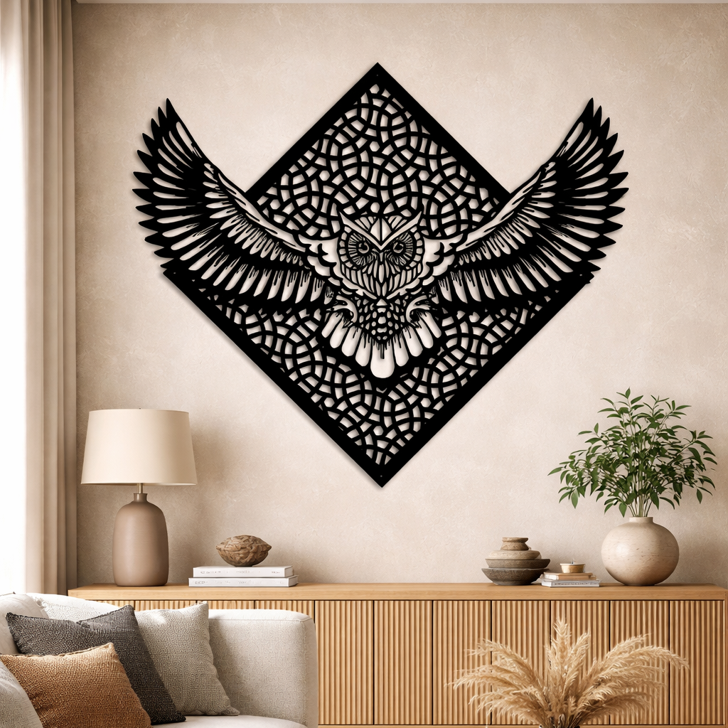 Command attention and symbolism with Owl Metal Wall Art, a striking piece that embodies wisdom, protection, and quiet power. Featuring an intricately detailed owl with wings fully outstretched, this artwork is framed within a geometric diamond pattern, blending natural strength with refined symmetry.