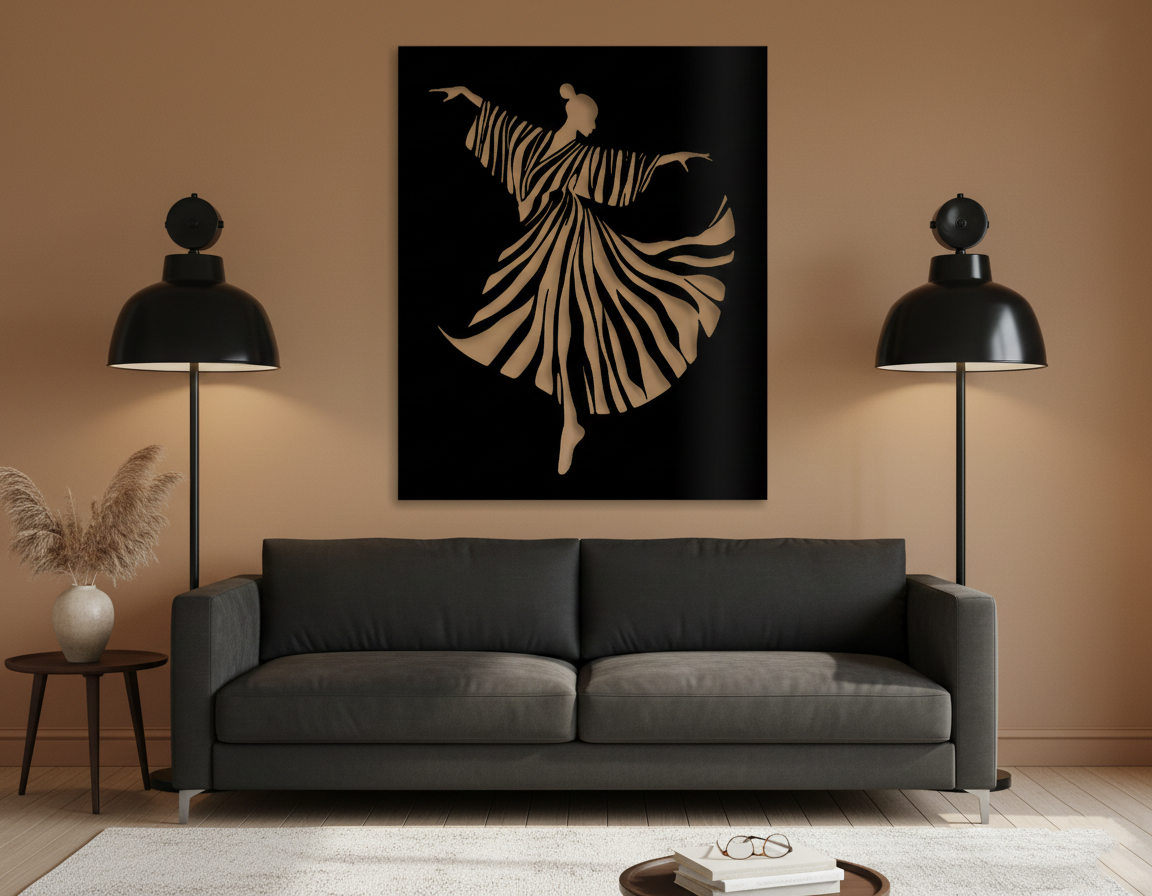 Graceful, meditative, and full of motion, Silent Whirl Metal Wall Art captures the beauty of movement frozen in time. Inspired by the spiritual elegance of whirling dance, this artwork depicts a flowing figure formed through rhythmic, sweeping lines that radiate calm, balance, and inner stillness.